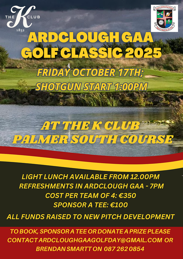 The Ardclough GAA Golf Outing will take place on Friday, October 17th. We're playing on The K Club South course again and we are very grateful for the support of Michael Fetherston and all his team at The K Club again.
