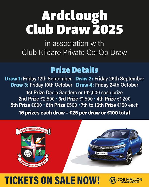 The fourth Draw of the 2025 Kildare GAA Club Draw takes place this evening, Friday, October 24th, at 6:25pm in Joe Mallon Motors, Sallins Road, Naas.