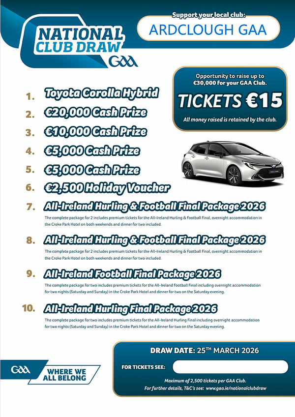 If you would like to purchase tickets or help the club to sell tickets, please contact email secretary.ardclough.kildare@gaa.ie