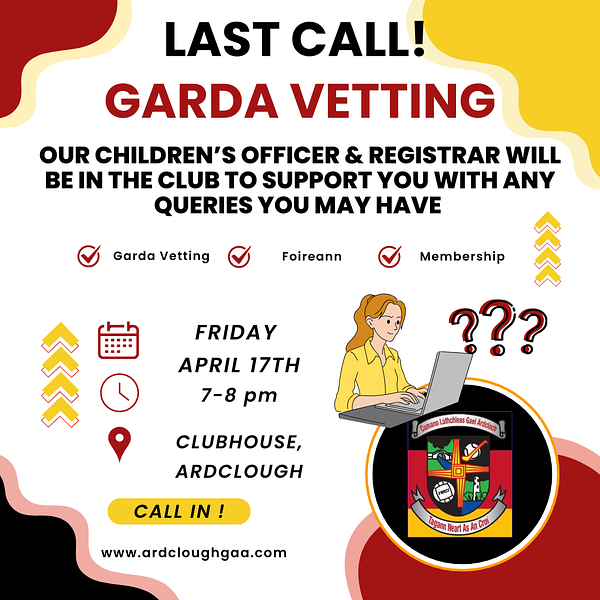 Sharon will be in the club this Friday - please make sure you call in if you need ID validated or any help with vetting, Foireann or safeguarding